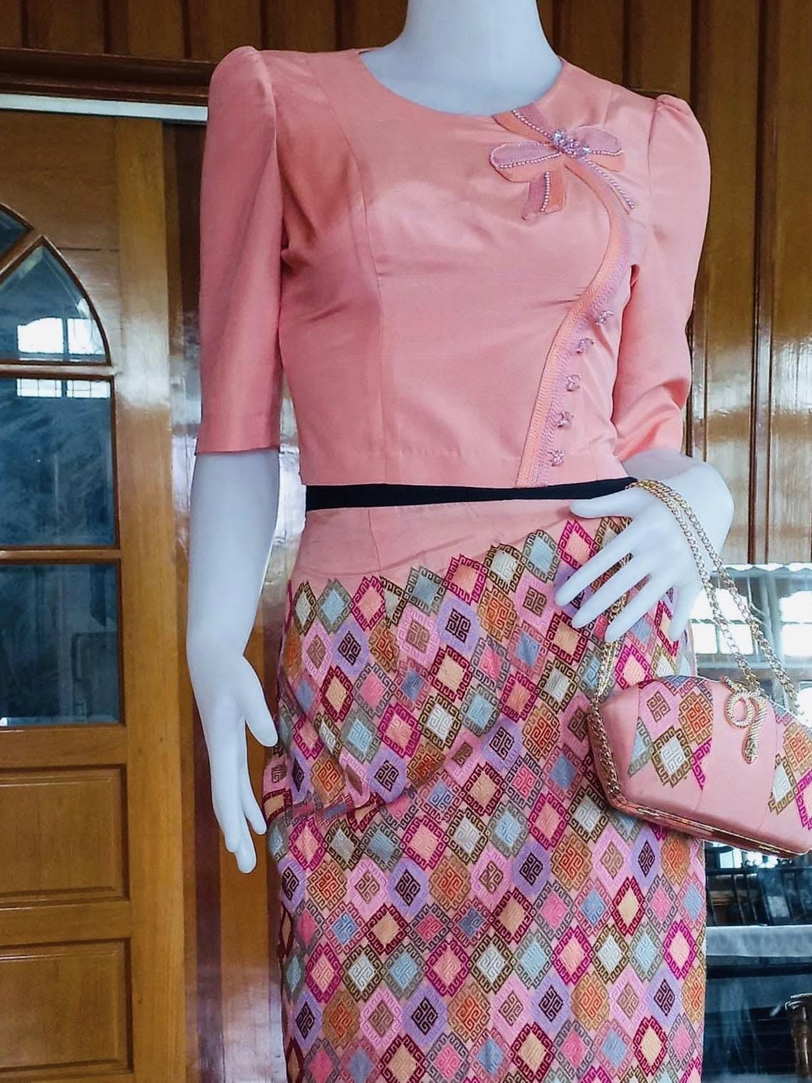 ကချင်ထည်ရင်ဖုံးလေးကို ကြိုးလေးတွေသုံးပြီး ဖဲပြားလှလှလေးနဲ့ ပုံဖော်အလှဆင်ပေးထားပါတယ်။